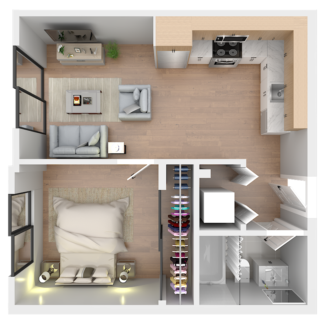 This bright and thoughtfully designed Unit Type D is located on the second floor, positioned toward the rear of the building and facing west, allowing for beautiful natural light to fill the space throughout the day. Sliding glass doors open to a charming Juliet balcony, creating an open, airy atmosphere and offering a pleasant village-facing outlook.